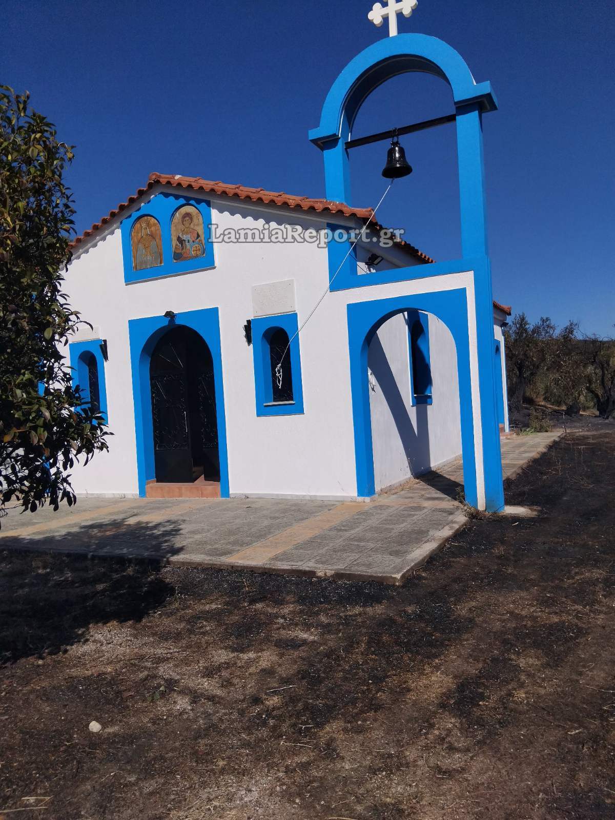 Οι φλόγες «έγλειψαν» το εκκλησάκι της Αγίας Αικατερίνης, που σώθηκε χάρη στην έγκαιρη επέμβαση των πυροσβεστών και των κατοίκων.