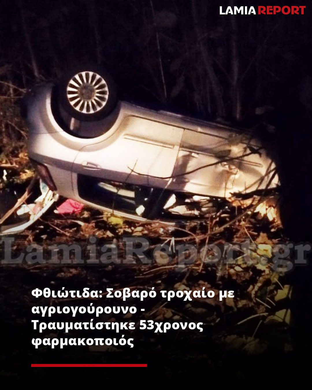 Σοβαρό τροχαίο ατύχημα εξαιτίας αγριογούρουνου, είχαμε γύρω στις 21:30’ το βράδυ της Πέμπτης (12/12) στο δρόμο Λαμίας - Στυλίδας στο ύψος του Αυλακίου.