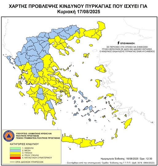 Για πρώτη φορά από τις 6 Αυγούστου η Περιφέρεια Στερεάς Ελλάδας «βάφεται κίτρινη» στο χάρτη επικινδυνότητας πυρκαγιάς που εκδίδει η Γενική Γραμματεία Πολιτικής Προστασίας και αφορά την Κυριακή 17 Αυγούστου 2025.