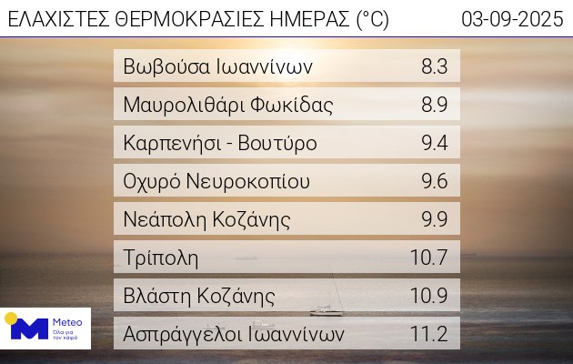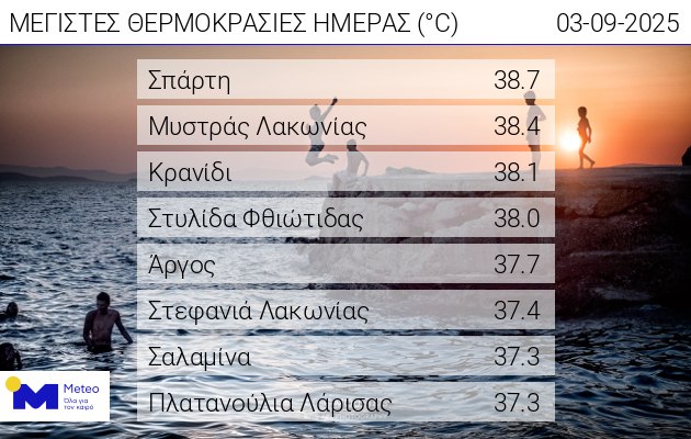 Δείτε τον πίνακα του meteo.gr με τις 8 υψηλότερες θερμοκρασίες της Τετάρτης 3/9/25:
