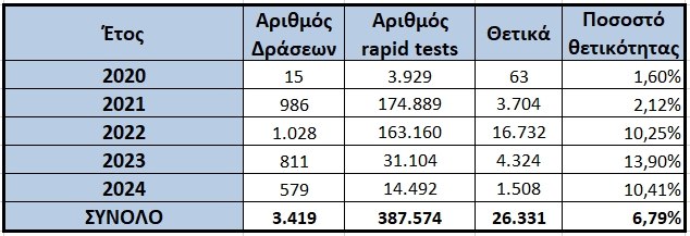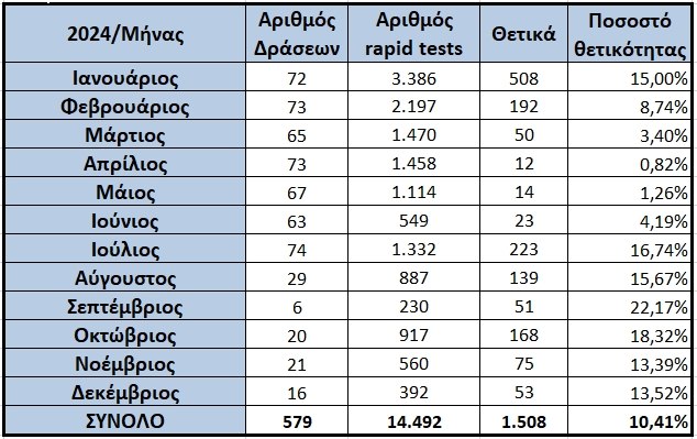 Όλον τον Δεκέμβριο έγιναν 392 rapid tests σε 16 δράσεις και βρέθηκαν 53 κρούσματα με το ποσοστό της θετικότητας να διαμορφώνεται στο 13,52%. Η θετικότητα ήταν σχεδόν η ίδια με του προηγούμενου μήνα (Νοέμβριος 13,39%) και λίγο πάνω από το μέσο όρο του χρόνου που ήταν 10,41%.