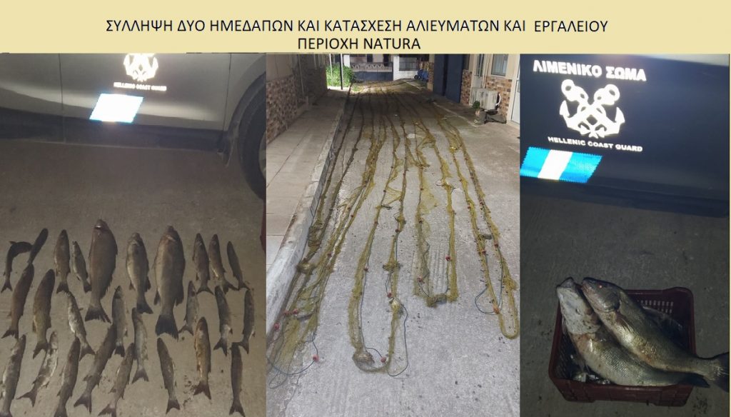 Οι συλληφθέντες είχαν αλιεύσει με το αλιευτικό εργαλείο «μανωμένο δίχτυ» με ένα επαγγελματικό-αλιευτικό (Ε/Π-Α/Κ) σκάφος είκοσι τέσσερα κιλά διαφόρων ειδών αλιευμάτων, σε περιοχή που όπως σημειώσαμε απαγορεύεται η αλιεία και η κυκλοφορία.
