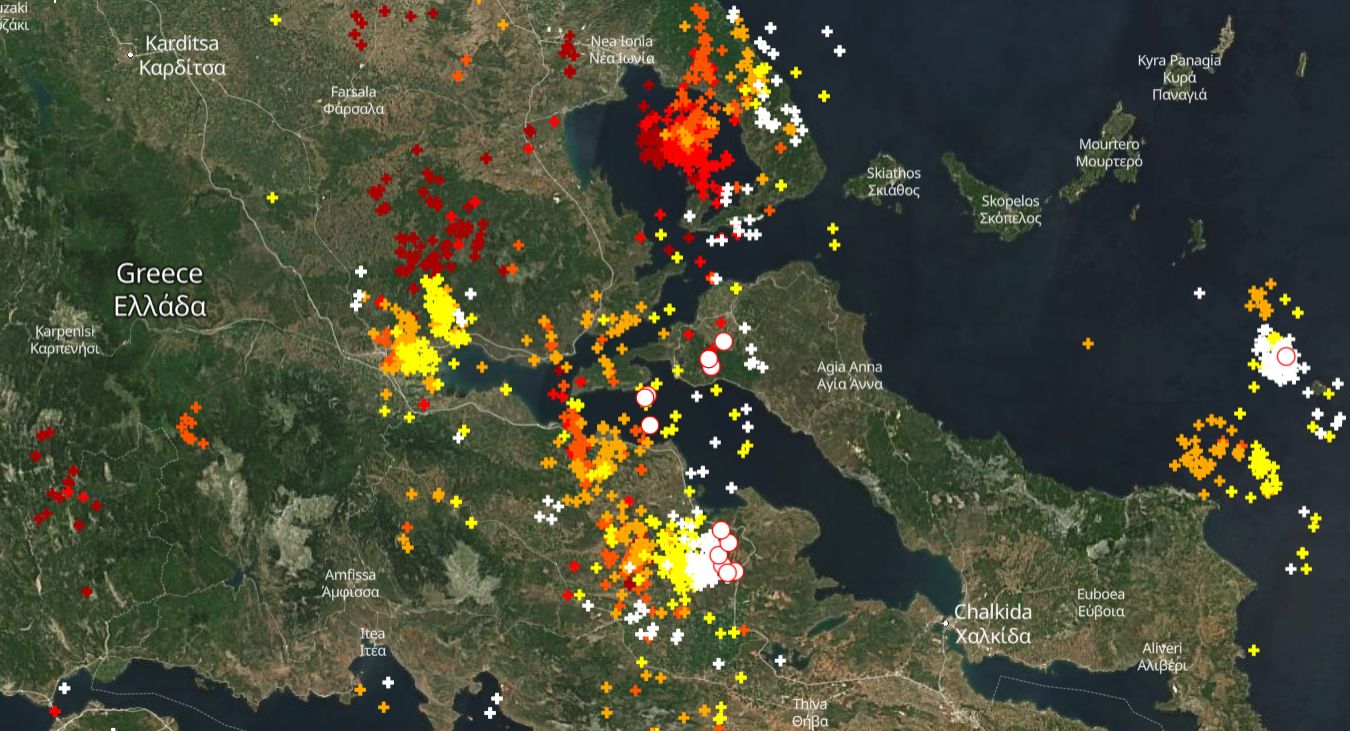 Στον παρακάτω χάρτη καταγράφεται η ένταση της καταιγίδας (15:00’ με 17:00’) πάνω από τη Λαμία και το Πήλιο. Η κακοκαιρία κινήθηκε νότια και νοτιοανατολικά προς Λοκρίδα και Σκύρο αντίστοιχα.