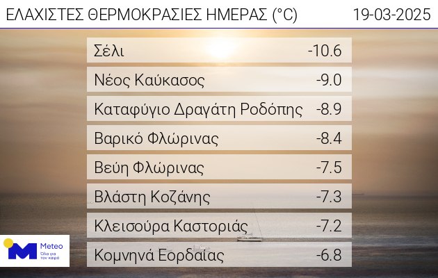 Πολύ χαμηλές θερμοκρασίες σημειώθηκαν σε όλα σχεδόν τα χιονοδρομικά κέντρα της χώρας, αλλά και σε πολλές ακόμη περιοχές, όπως φαίνεται και στον πίνακα του Meteo: