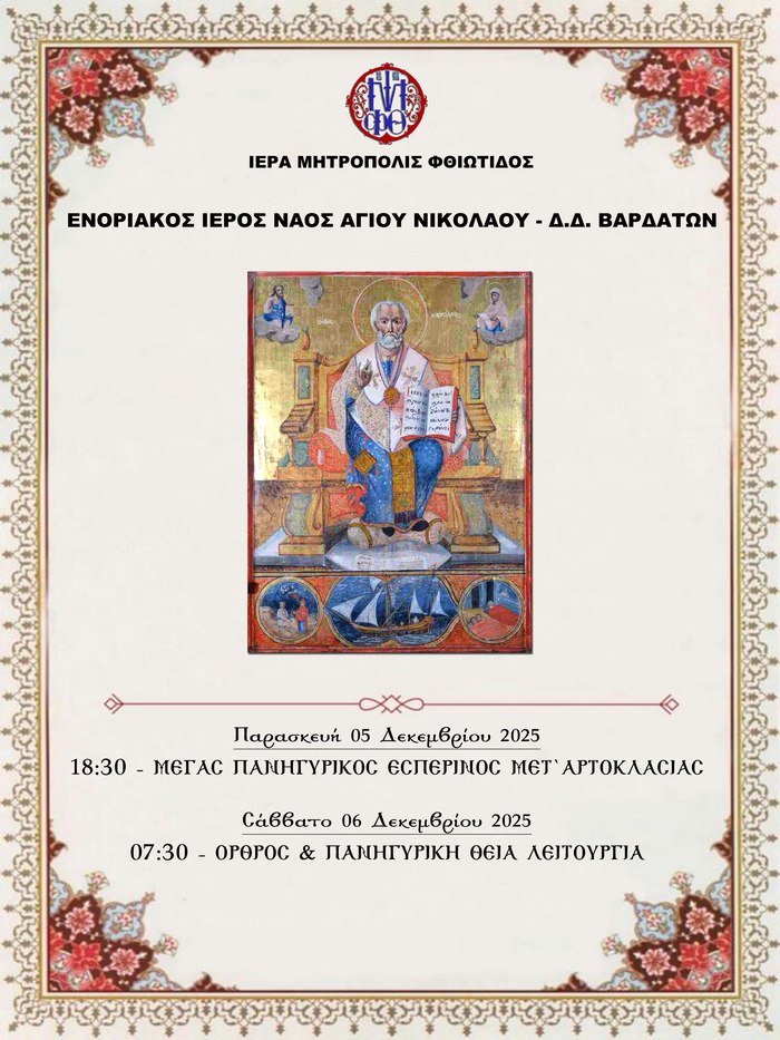 Ανήμερα της Εορτής, Σάββατο 6 Δεκεμβρίου 2025 και ώρα 07:30 , Όρθρος και Πανηγυρική Θεία Λειτουργία.