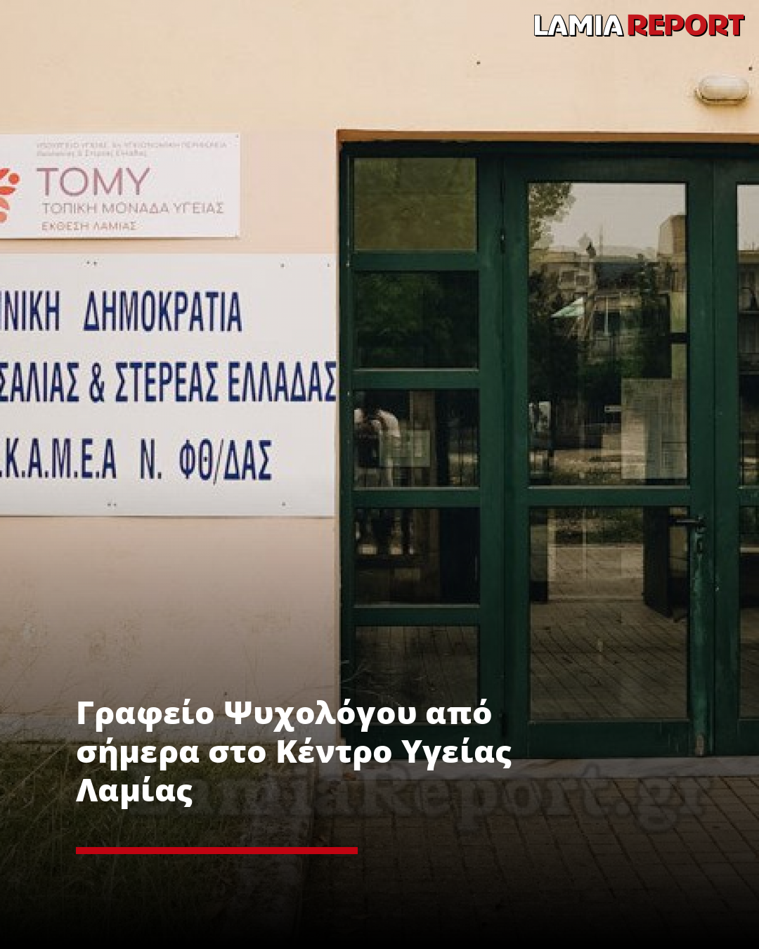 Το Γραφείο Ψυχολόγου του Κ.Υ. Λαμίας θα λειτουργήσει από την Δευτέρα 28 Ιουλίου 2025 στο Κέντρο Υγείας Λαμίας σ' έναν διακριτικό χώρο, στον 1ο όροφο του κτηρίου της 2ης TOMY Λαμίας (Παπαβασιλείου 6 και Χαλμούκου, όπισθεν 2ου Γυμνασίου και Λυκείου Λαμίας).