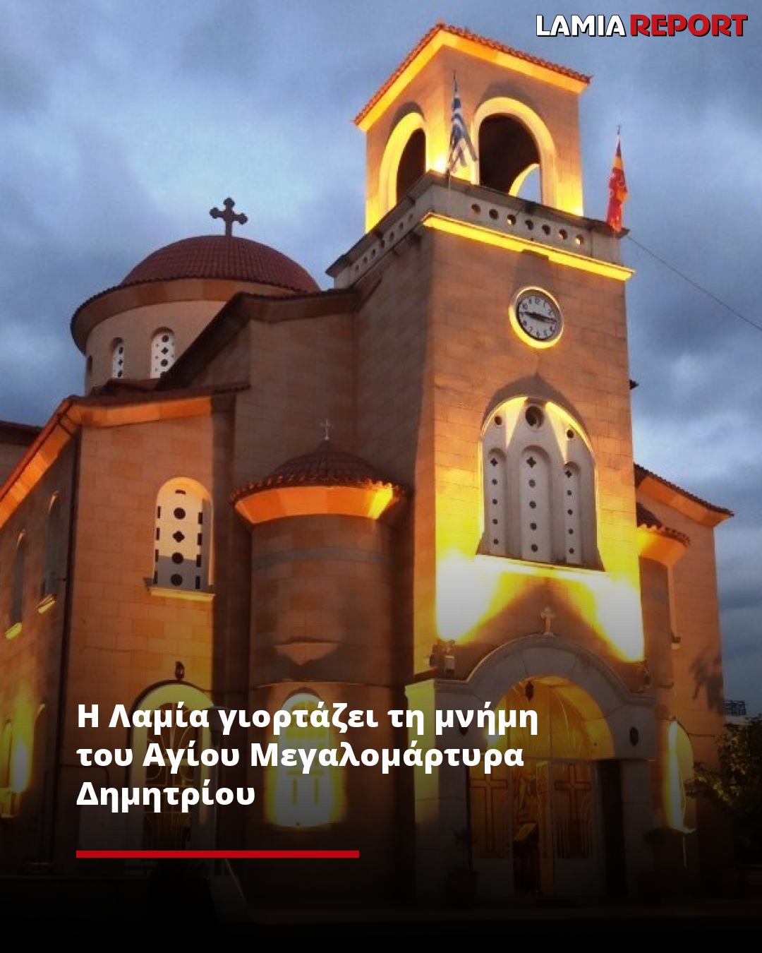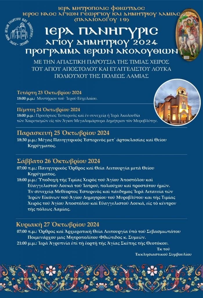 Αύριο Σάββατο 26 Οκτωβρίου η Αγία μας Εκκλησία εορτάζει και τιμά την μνήμη του Αγίου ενδόξου Μεγαλομάρτυρος Δημητρίου του Μυροβλύτου. Στην πόλη της Λαμίας πανηγυρίζει ο μεγαλοπρεπής και ιστορικός Ιερός Ναός του Αγίου Δημητρίου στο κέντρο της πόλεως (οδ. Παλαιολόγου 19), όπου και θα πραγματοποιηθεί ένα πενθήμερο λατρευτικό πρόγραμμα.