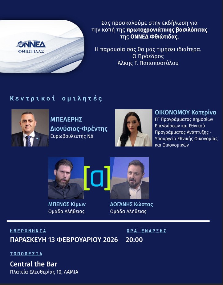 Παρουσία του Ευρωβουλευτή Φρέντη Μπελέρη και άλλων καλεσμένων, η ΟΝΝΕΔ Φθιώτιδας θα κόψει την πρωτοχρονιάτικη βασιλόπιτά της, στο Central the Bar (Πλατεία Ελευθερίας 10, Λαμία).