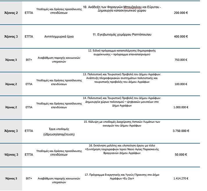 «Συνεργαστήκαμε με τον Δήμο Αγράφων, καταθέσαμε την Ολοκληρωμένη Χωρική Επένδυση Αγράφων, συνολικού προϋπολογισμού 22.464.270 ευρώ και την εντάξαμε πλέον στο ΕΣΠΑ της Περιφέρειάς μας. Η ιδιαιτερότητα της «ΟΧΕ» είναι η δυνατότητα που δίνει για τη συγχρηματοδότηση έργων και δράσεων, από τα τομεακά προγράμματα των συναρμόδιων Υπουργείων.