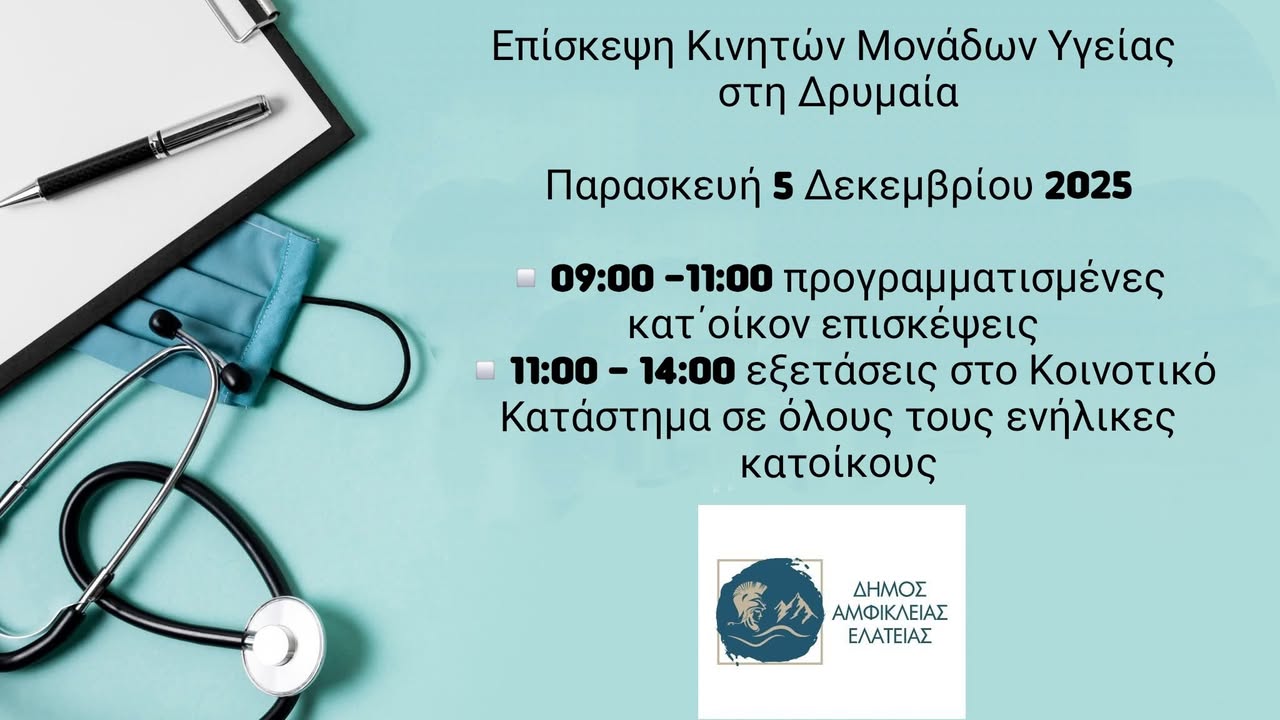 Στο πλαίσιο παροχής υπηρεσιών προληπτικής ιατρικής σε πολίτες που διαμένουν σε απομακρυσμένες περιοχές ή αδυνατούν να μετακινηθούν, οι Κινητές Ομάδες Υγείας (ΚΟΜΥ) του Υπουργείου Υγείας και του ΕΟΔΥ θα επισκεφθούν τη Δημοτική Κοινότητα Δρυμαίας σήμερα Παρασκευή 5 Δεκεμβρίου 2025 και ώρα 9:00’ το πρωί.