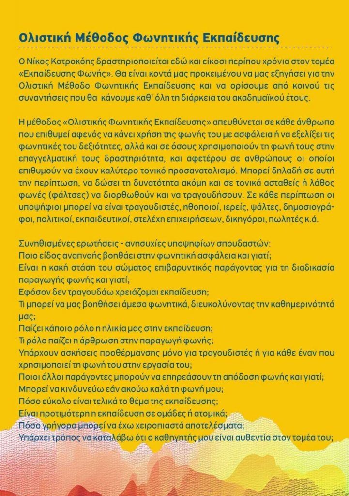 Ο κ. Νίκος Κοτροκόης δραστηριοποιείται εδώ και είκοσι περίπου χρόνια στον τομέα «Εκπαίδευσης Φωνής». Θα είναι κοντά μας προκειμένου να μας εξηγήσει για την Ολιστική Μέθοδο Φωνητικής Εκπαίδευσης και να ορίσουμε από κοινού τις συναντήσεις που θα κάνουμε καθ’ όλη τη διάρκεια του ακαδημαϊκού έτους.