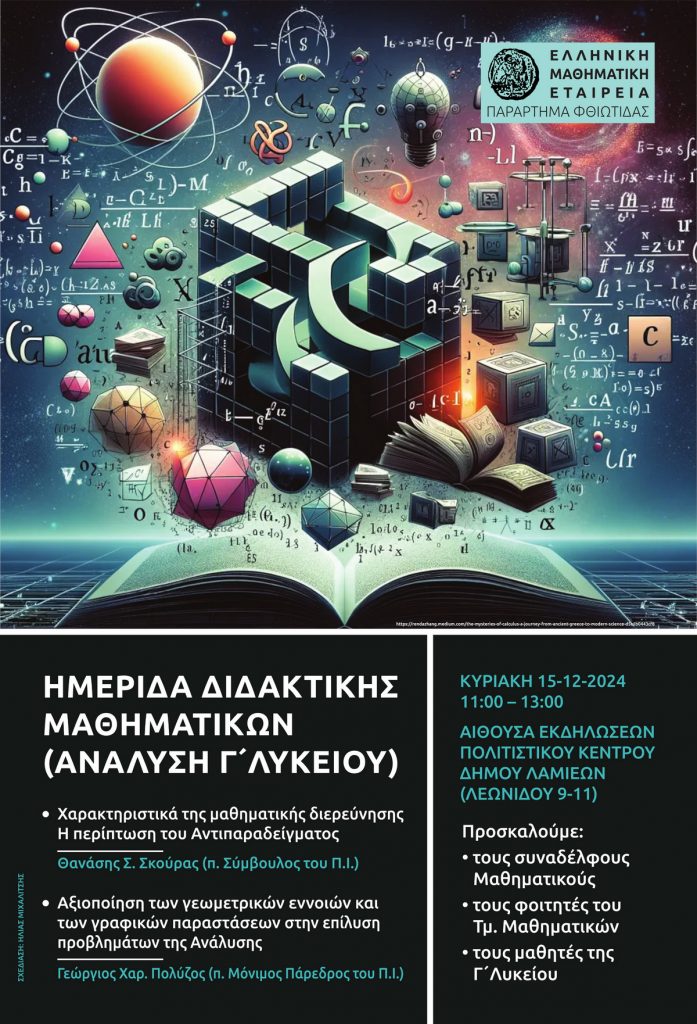 Το Παράρτημα Φθιώτιδας της Ελληνικής Μαθηματικής Εταιρείας πραγματοποιεί την Κυριακή 15 Δεκεμβρίου 2024 και ώρα 11:00 π.μ στο Πολιτιστικό Κέντρο του Δήμου Λαμιέων (Λεωνίδου 9 – 11) την Ημερίδα Διδακτικής Μαθηματικών (Ανάλυση Γ’ Λυκείου)