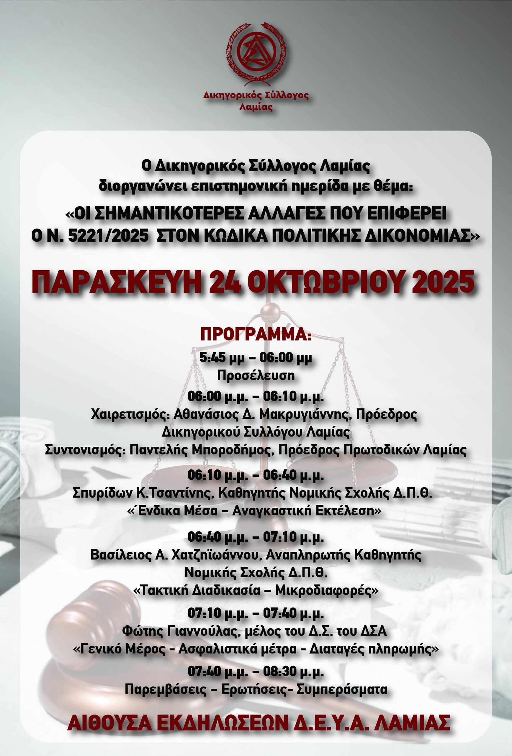 Ο Δικηγορικός Σύλλογος Λαμίας διοργανώνει επιστημονική Ημερίδα με θέμα "Οι σημαντικότερες αλλαγές που επιφέρει ο Ν. 5221/2025 στον Κώδικα Πολιτικής Δικονομίας", την Παρασκευή 24 Οκτωβρίου 2025, στην αίθουσα εκδηλώσεων της ΔΕΥΑ Λαμίας.