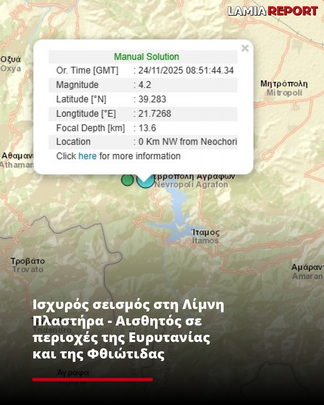 Ισχυρός σεισμός στη Λίμνη Πλαστήρα - Αισθητός σε περιοχές της Ευρυτανίας και της Φθιώτιδας