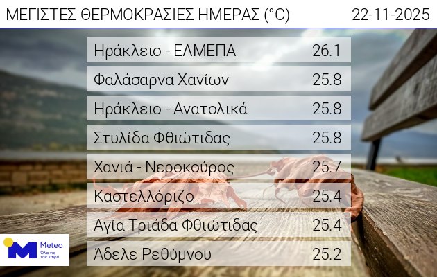Ενδεικτικά στη Λαμία από την Τρίτη μέχρι και το Σάββατο η μέγιστη κινήθηκε από 21.3 έως 24,8 βαθμούς κελσίου, ενώ η χαμηλότερη θερμοκρασία καταγράφηκε την Τρίτη ίση με 13,7 βαθμούς.