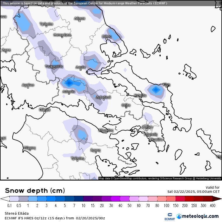Ο παρακάτω χάρτης υπολογίζει τη χιονόπτωση μέχρι το πρωί του Σαββάτου (22/2).