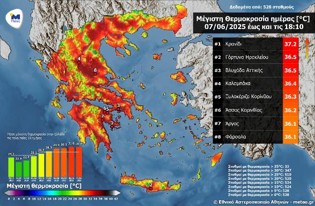Σε υψηλά επίπεδα διατηρήθηκε η θερμοκρασία το Σάββατο 07/06, με τις μέγιστες τιμές της να φτάνουν για ακόμα μία ημέρα στους 36-37 °C.