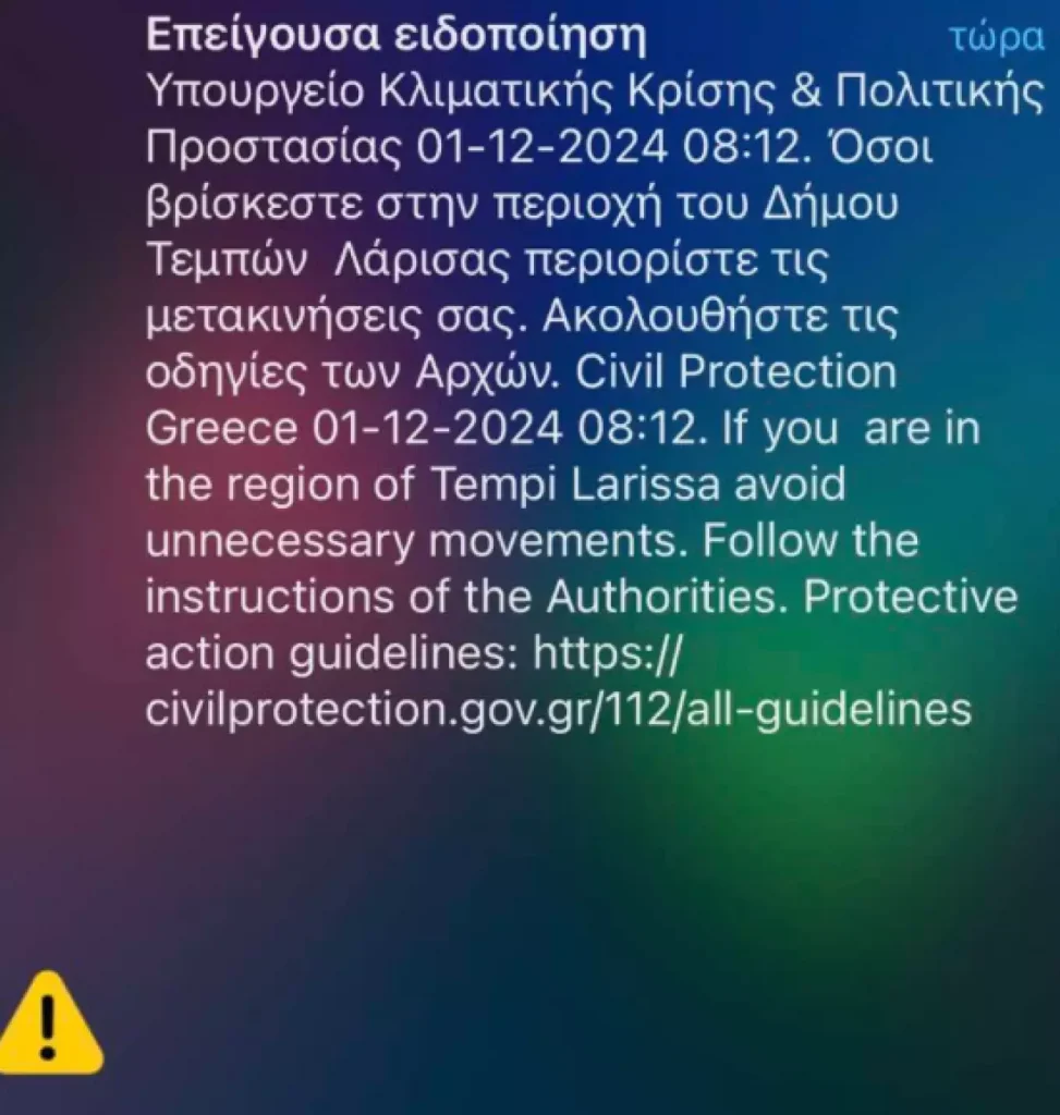 Συγκεκριμένα νέο προειδοποιητικό μήνυμα από την Πολιτική Προστασία, εστάλη στα κινητά των Λαρισαίων στις 8.12 το πρωί της Κυριακής εφιστώντας την προσοχή για την κακοκαιρία «Bora», ειδικότερα για την περιοχή του Δήμου Τεμπών.
