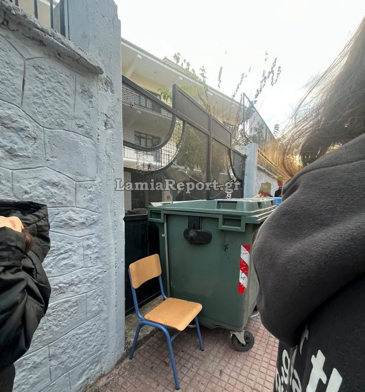 Το πρωί οι εκπαιδευτικοί που πήγαν να αναλάβουν υπηρεσία, βρήκαν κλειστές τις πόρτες και στην μεγάλη είσοδο παραταγμένους κάδους και καρέκλες από το σχολείο.