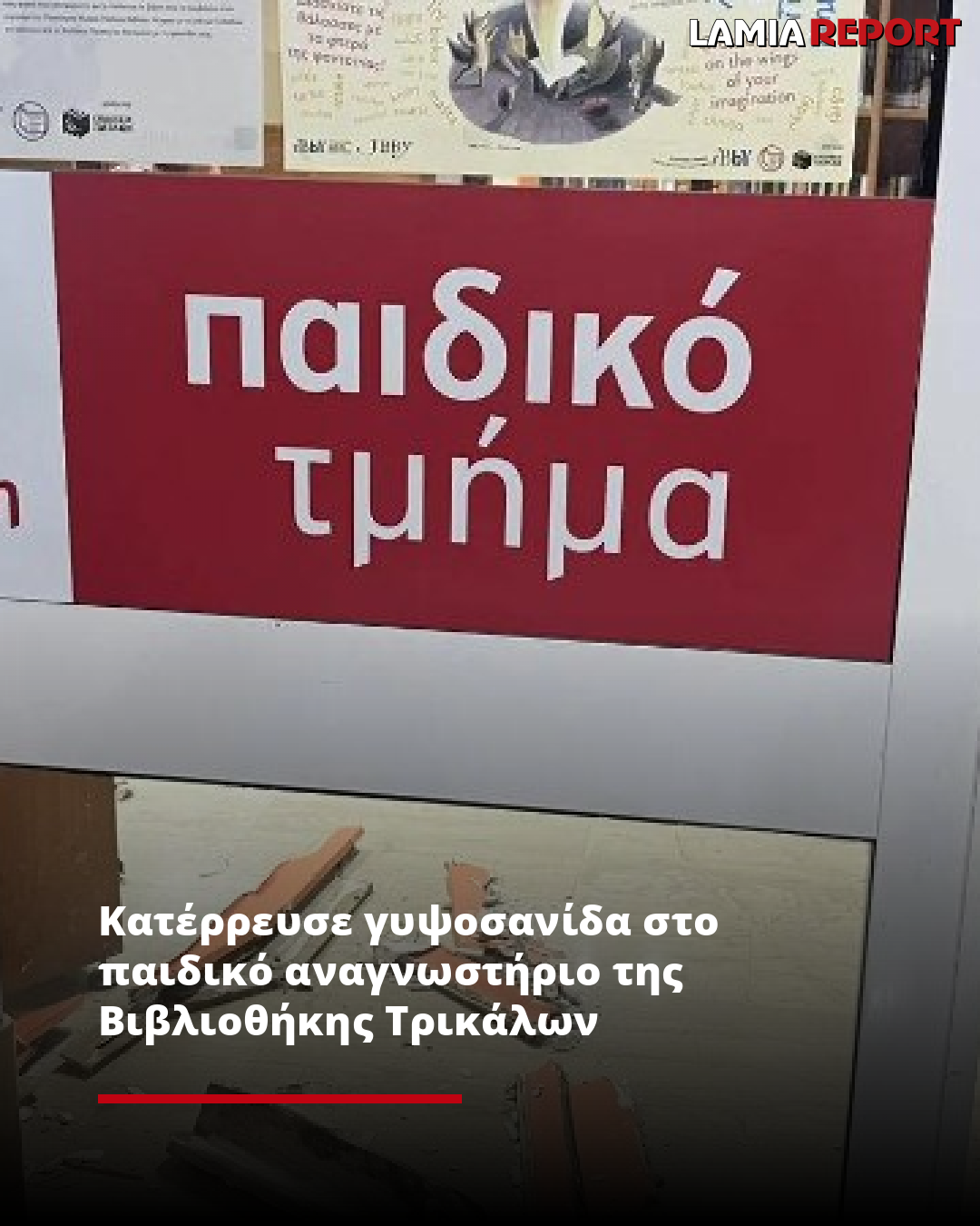 Κατέρρευσε γυψοσανίδα στο παιδικό αναγνωστήριο της Δημοτικής Βιβλιοθήκης Τρικάλων, την ώρα που στον χώρο βρίσκονταν παιδιά, επιβεβαιώνοντας την ανησυχία για τις αντοχές του κτιρίου που στεγάζει το Πνευματικό Κέντρο. Το περιστατικό καταγράφηκε από το trikalanews.gr, με τις φωτογραφίες να αποτυπώνουν το μέγεθος του κινδύνου για εργαζόμενους και μικρούς αναγνώστες.