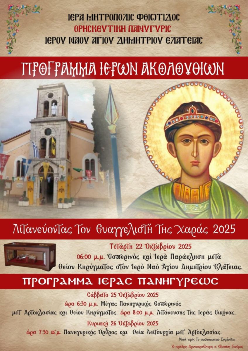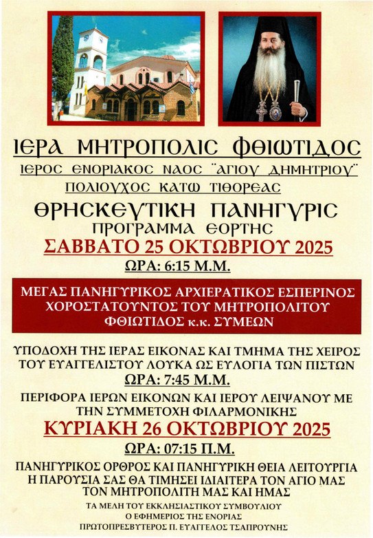 Πανηγυρίζει ο ιερός ενοριακός ναός Αγίου Δημητρίου στην Κάτω Τιθορέα και στην Ελάτεια!