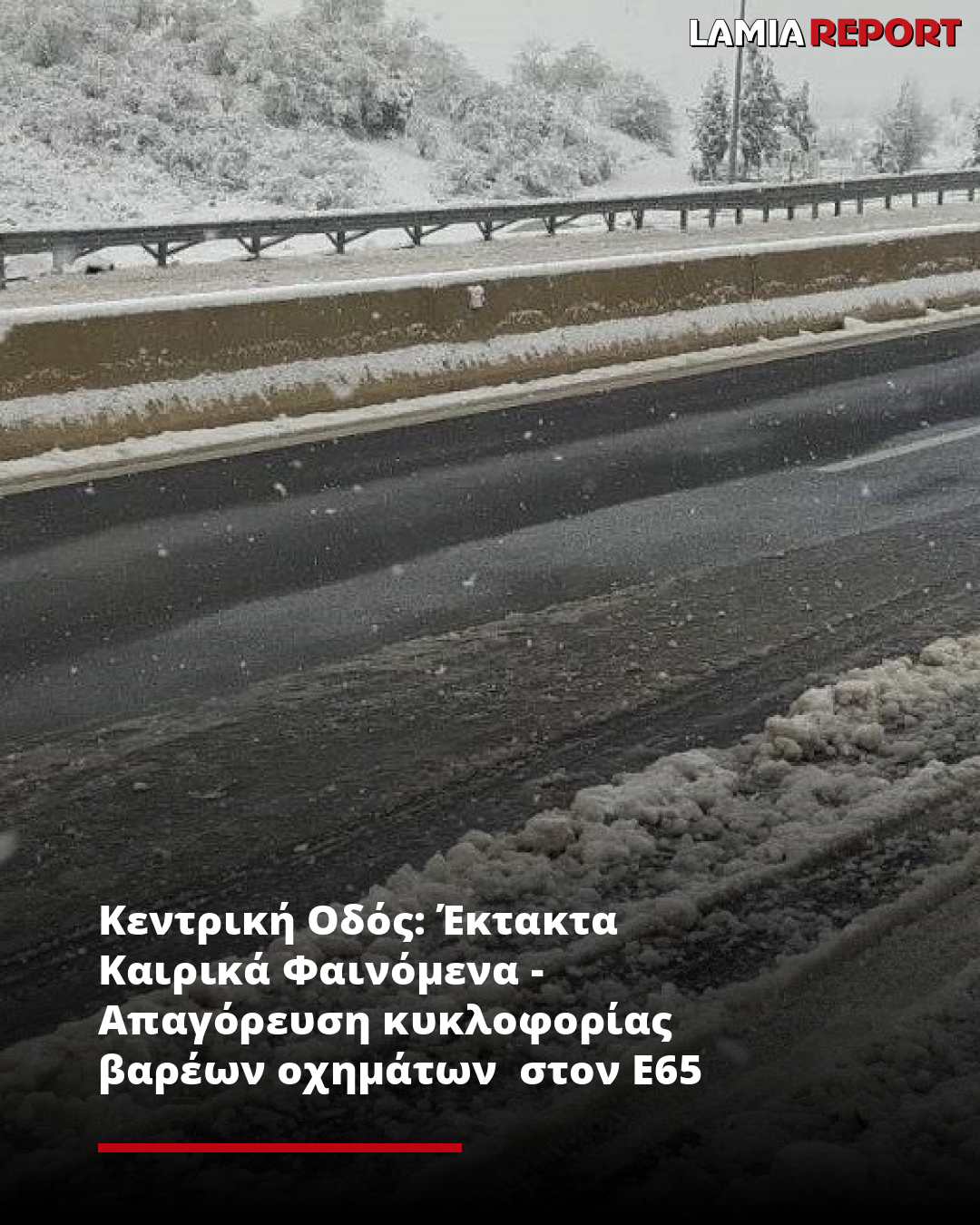 «Η Κεντρική Οδός ενημερώνει ότι σύμφωνα με Απόφαση της Διεύθυνσης Αστυνομίας Φθιώτιδας, από σήμερα 13/1 στις 09:30 μέχρι και την ύφεση των έντονων καιρικών φαινομένων, ισχύει διακοπή της κυκλοφορίας παντός είδους βαρέως οχήματος μέγιστου επιτρεπόμενου βάρους άνω των 3,5 τόνων, ανεξαρτήτως χρήσεως αντιολισθητικών αλυσίδων, από τον Ανισόπεδο Κόμβο Καρπενησίου (14,5ο χλμ.) έως και το 111,4ο χλμ. και στα δύο ρεύματα κυκλοφορίας του αυτοκινητοδρόμου Κεντρικής Ελλάδας- Ε65.