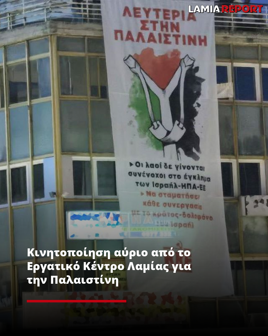 Εκφράζοντας την αλληλεγγύη τους στο λαό της Παλαιστίνης που δοκιμάζεται, το Εργατοϋπαλληλικό Κέντρο Λαμίας, ετοιμάζει την Κυριακή 24 Αυγούστου 2025 στις 19:00’ κινητοποίηση στην παραλία του Αγίου Παντελεήμονα στα Καμένα Βούρλα.