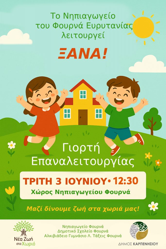 Το Νηπιαγωγείο του Φουρνά Ευρυτανίας, που είχε αναστείλει τη λειτουργία του λόγω έλλειψης παιδιών, επαναλειτουργεί και ο Δήμος Καρπενησίου μας προσκαλεί, με χαρά και συγκίνηση, στην Τελετή επαναλειτουργίας του την Τρίτη 3 Ιουνίου 2025 και ώρα 12:30 μ.μ. (Προαύλιος χώρος Νηπιαγωγείου Φουρνά).