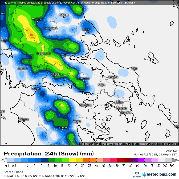 Σύμφωνα με τα προγνωστικά μοντέλα το χιόνι θα φτάσει και σε χαμηλότερα υψόμετρα μέχρι το μεσημέρι της Δευτέρας.