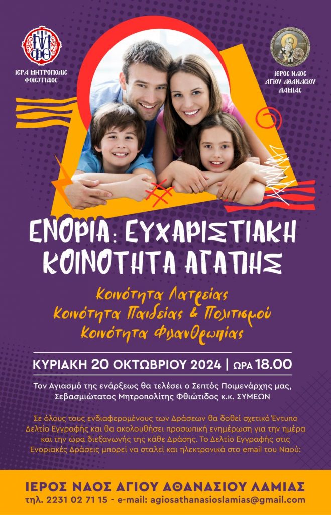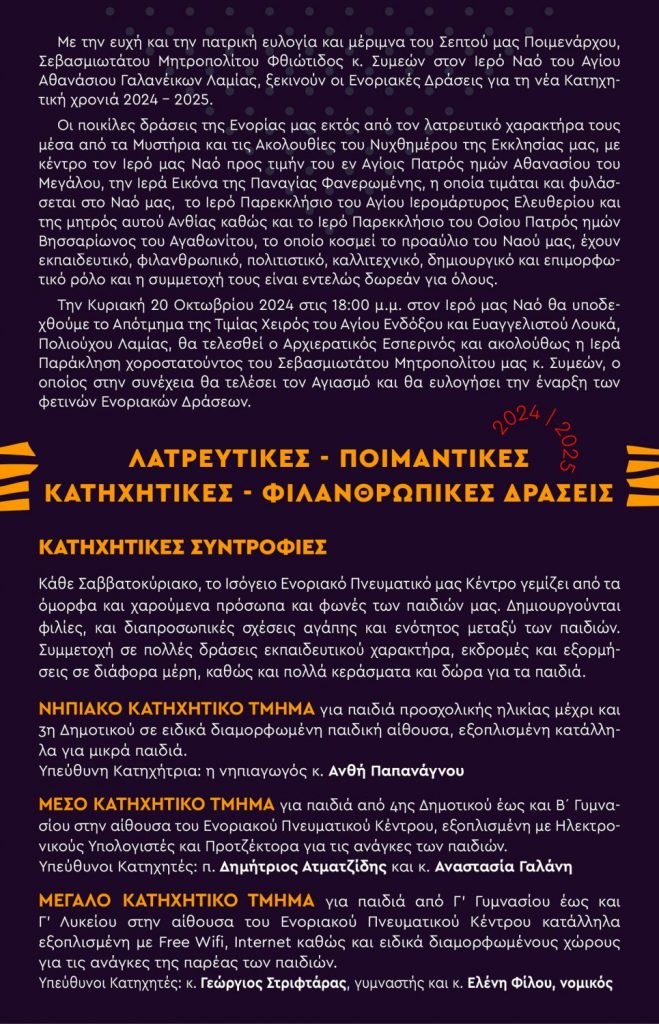 Την Κυριακή 20 Οκτωβρίου στις 6:00' το απόγευμα με την Ακολουθία του Αγιασμού ξεκινά επίσημα η Κατηχητική Χρονιά 2024 - 2025 υπό τον τίτλο: «Ενορία: Ευχαριστιακή Κοινότητα Αγάπης».