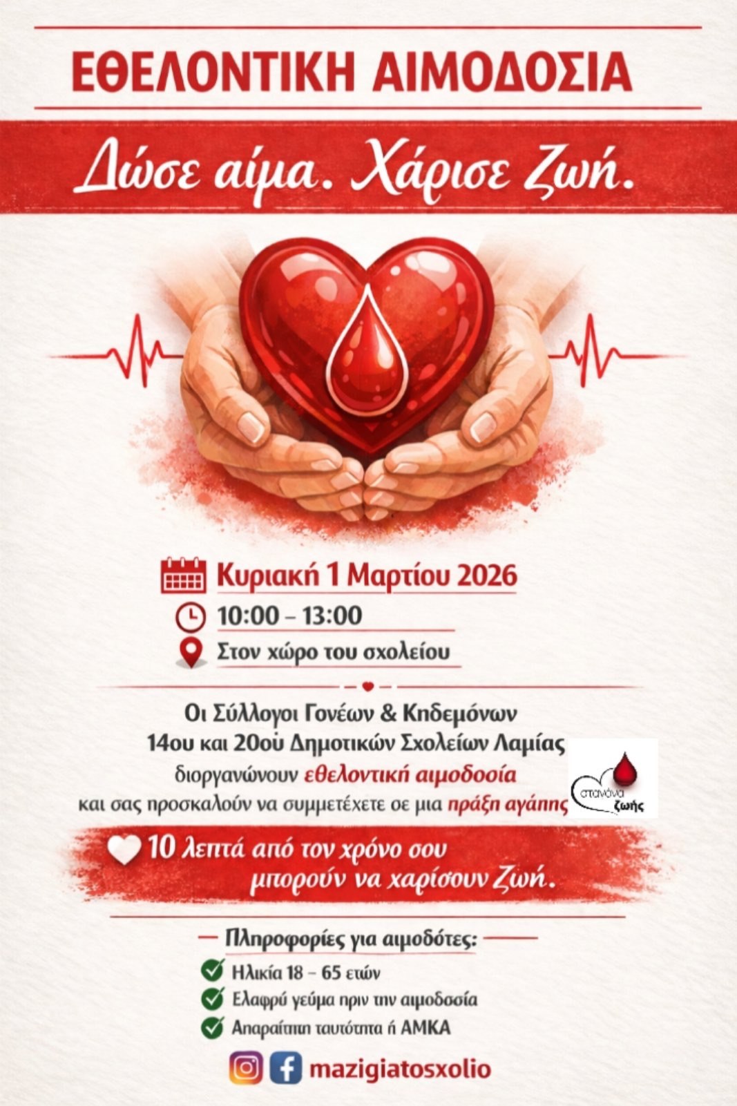 Οι Σύλλογοι Γονέων και Κηδεμόνων 14ου και 20ού Δημοτικών Σχολείων Λαμίας διοργανώνουν εθελοντική αιμοδοσία στον χώρο του σχολείου την Κυριακή 1η Μαρτίου 2026 και ώρα 10:00π.μ – 1:00μ.μ.