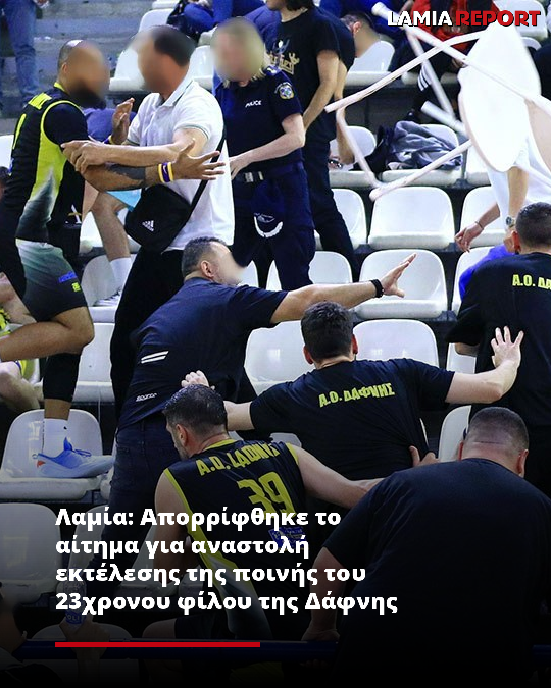 Στο Αυτόφωρο Τριμελές Πλημμελειοδικείο Λαμίας εξετάστηκε σήμερα το αίτημα, του 23χρονου φίλου της Ομάδας Μπάσκετ της Δάφνης, ο οποίος έχει καταδικαστεί σε 14 μήνες φυλάκισης γιατί γρονθοκόπησε νεαρό καλαθοσφαιριστή αντίπαλης ομάδας, για αναστολή εκτέλεση της ποινής του μέχρι την εκδίκαση της έφεσης.