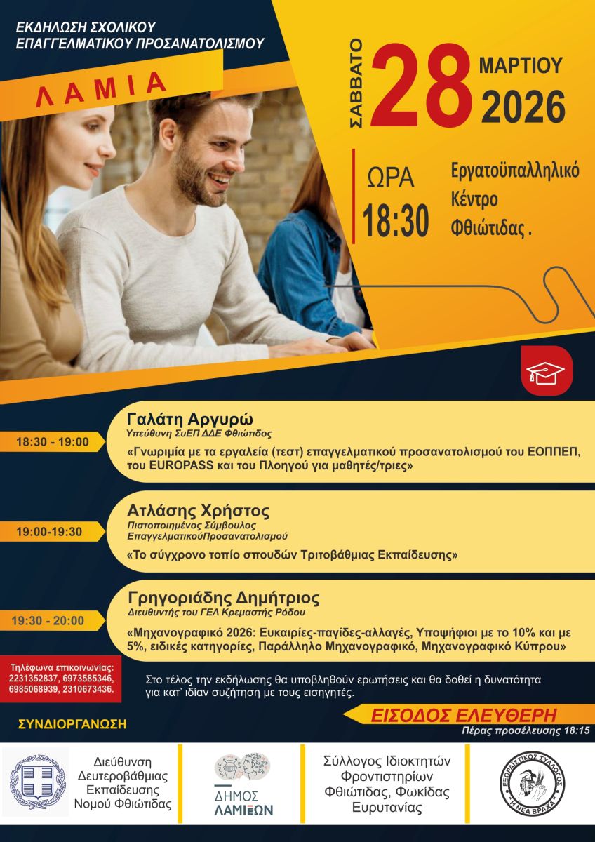 Η Διεύθυνση Δευτεροβάθμιας Εκπαίδευσης Νομού Φθιώτιδας, ο Δήμος Λαμιέων, ο Σύλλογος Ιδιοκτητών Φροντιστηρίων Φθιώτιδας, Φωκίδας και Ευρυτανίας και ο Εξωραϊστικός Σύλλογος "Η Νέα Βράχα", αναγνωρίζοντας την ανάγκη για συνεχή ενημέρωση μαθητών/ριών και γονέων σχετικά με θέματα επαγγελματικού προσανατολισμού, διοργανώνουν εκδήλωση το Σάββατο 28 Μαρτίου 2026, στις 18:30', στο «Εργατοϋπαλληλικό κέντρο» Φθιώτιδας .