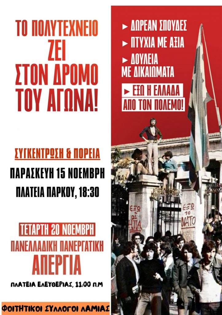 Με τα παραπάνω λόγια και με το πόσο επίκαιρο είναι και πάλι το σύνθημα «ψωμί – παιδεία – ελευθερία» στον αγώνα τους για σπουδές χωρίς εμπόδια, οι Φοιτητικοί Σύλλογοι Λαμίας καλούν στη συγκέντρωση για το Πολυτεχνείο, την Παρασκευή 15 Νοεμβρίου στις 11:00’ το πρωί στην πλατεία Ελευθερίας.