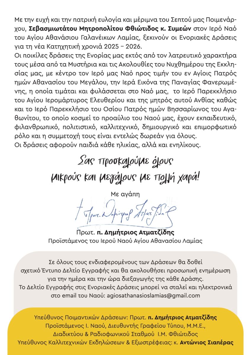 Με την ευχή και την πατρική ευλογία και μέριμνα του Σεπτού μας Ποιμενάρχου, Σεβασμιωτάτου Μητροπολίτου Φθιώτιδος κ. Συμεών στον Ιερό Ναό του Αγίου Αθανάσιου Γαλανέικων Λαμίας, ξεκινούν οι Ενοριακές Δράσεις για τη νέα Κατηχητική χρονιά 2025 – 2026.