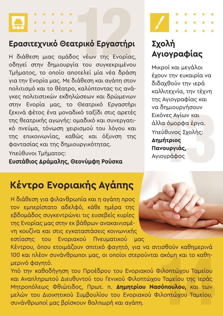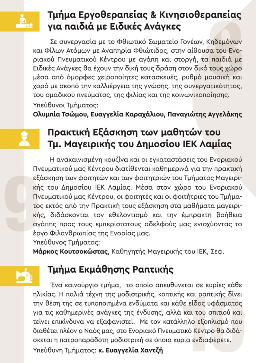 Σε συνεργασία με το Φθιωτικό Σωματείο Γονέων, Κηδεμόνων και Φίλων Ατόμων με Αναπηρία Φθιώτιδος, στην αίθουσα του Ενοριακού Πνευματικού Κέντρου με αγάπη και στοργή, τα παιδιά με Ειδικές Ανάγκες θα έχουν την δική τους δράση στον δικό τους χώρο μέσα από όμορφες χειροποίητες κατασκευές, ρυθμό μουσική και χορό με σκοπό την καλλιέργεια της γνώσης, της συνεργατικότητος, του ομαδικού πνεύματος, της φιλίας και της κοινωνικοποίησης.