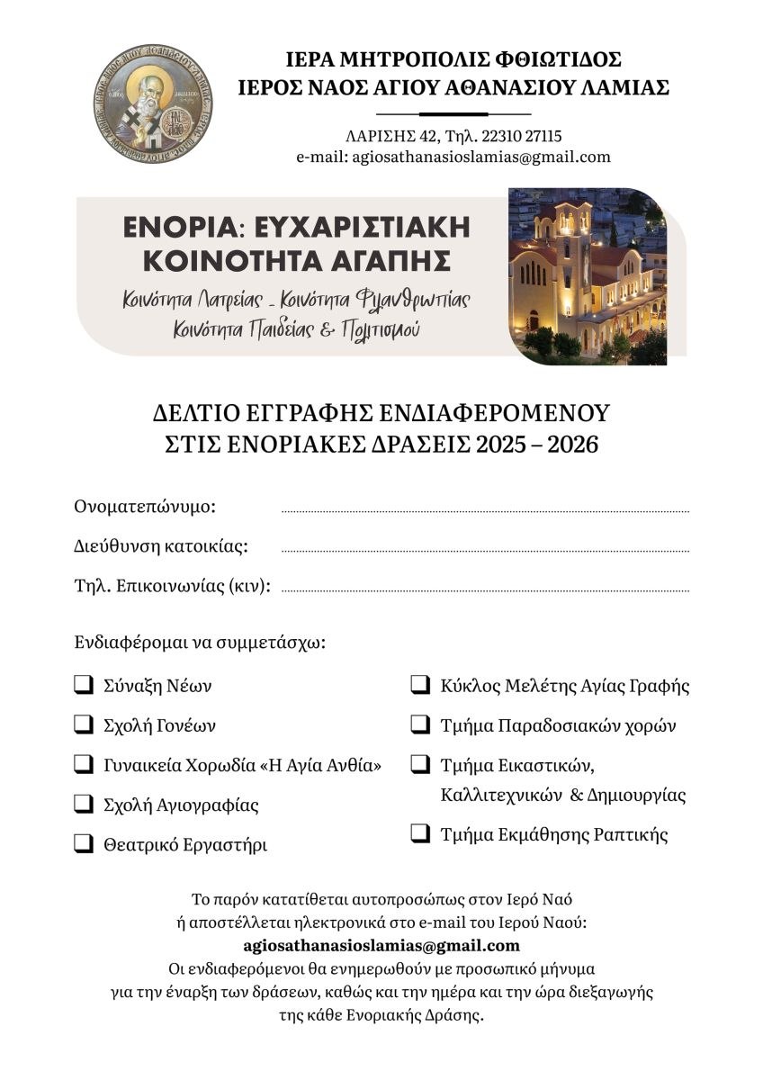 Το Δελτίο Εγγραφής στις Ενοριακές Δράσεις μπορεί να σταλεί και ηλεκτρονικά στο email του Ναού: [email protected]