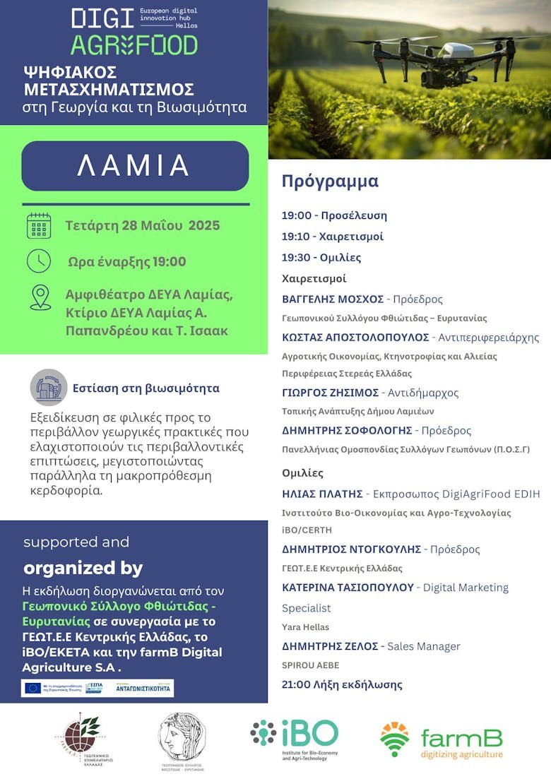 Λαμία: Ο Γεωπονικός Σύλλογος Φθιώτιδας - Ευρυτανίας διοργανώνει ημερίδα με θέμα «Ψηφιακός Μετασχηματισμός στη Γεωργία και τη Βιωσιμότητα»