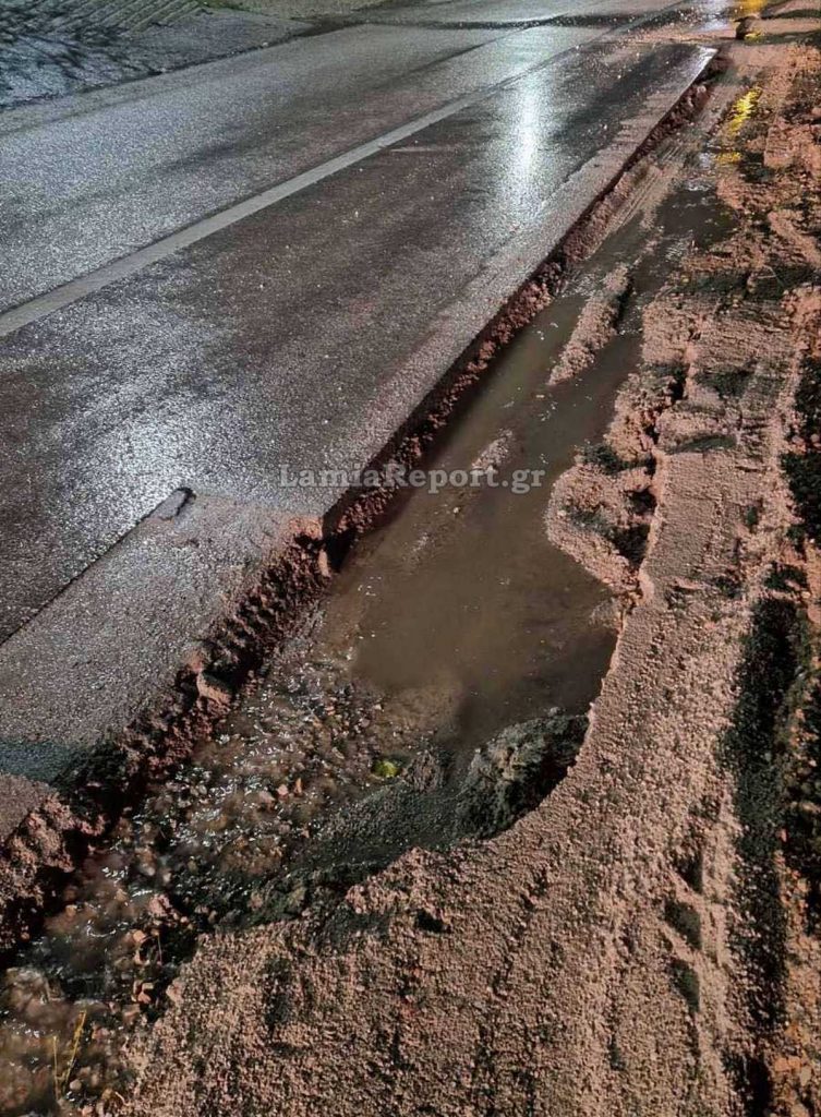 Μάλιστα η Τροχαία Λαμίας που κατέγραψε το συμβάν, έβαλε και προειδοποιητικές κορδέλες, καθώς διερχόμενο όχημα παρέσυρε τον προσωρινό κώνο που τοποθέτησε στο σημείο για τη σήμανση του τροχαίου.