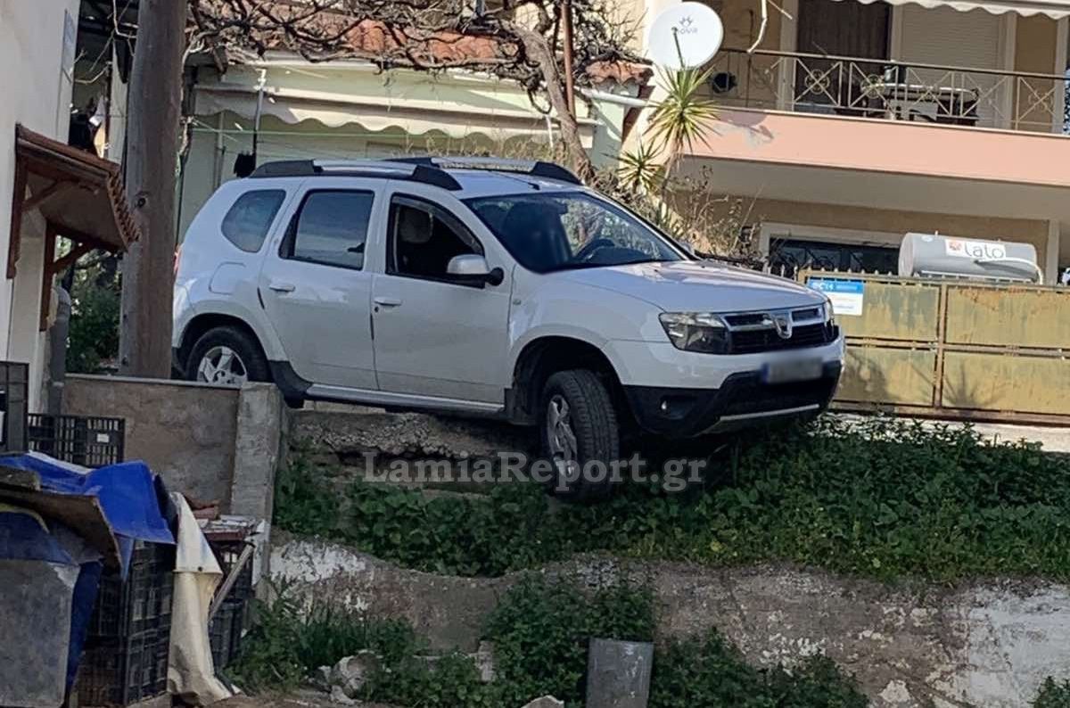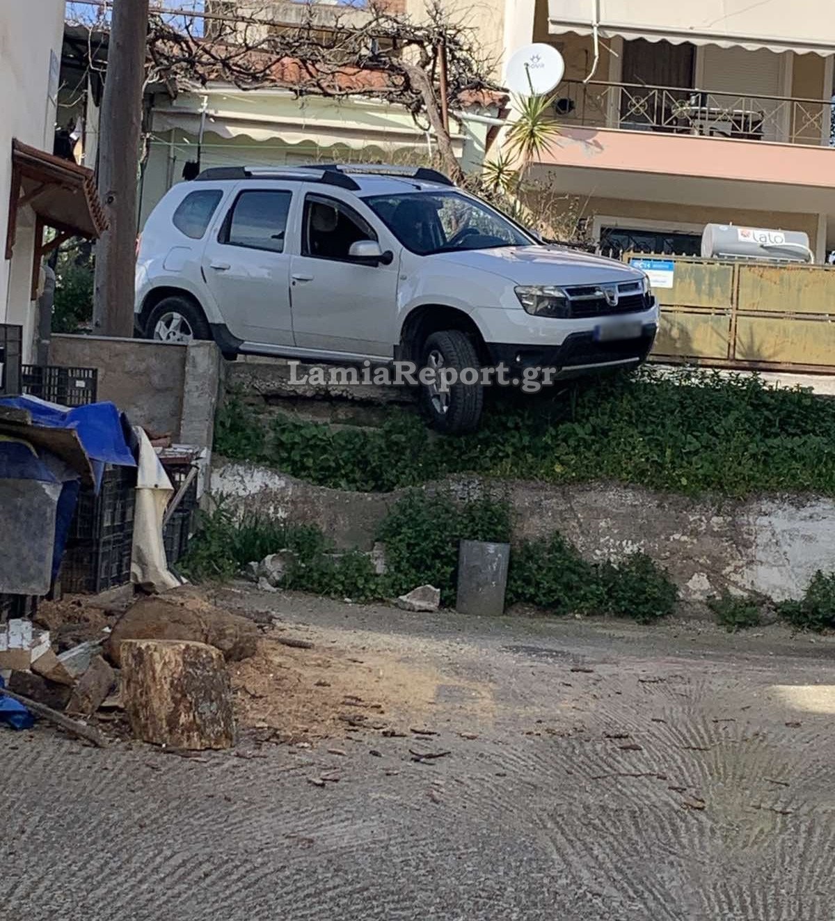 Το αυτοκίνητο ευτυχώς δεν έκανε βουτιά, αλλά «κρεμάστηκε», όπως το βλέπετε στις φωτογραφίες.