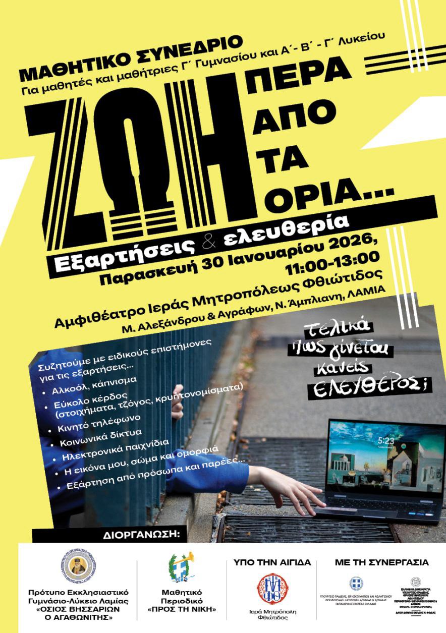 Το Πρότυπο Εκκλησιαστικό Γυμνάσιο και Λύκειο Λαμίας «Όσιος Βησσαρίων ο Αγαθωνίτης» και το Μαθητικό Περιοδικό «ΠΡΟΣ ΤΗ ΝΙΚΗ» σε συνεργασία με την Περιφερειακή Διεύθυνση Εκπαίδευσης Στερεάς Ελλάδος, την Δευτεροβάθμια Εκπαίδευση Νομού Φθιώτιδος, την Σύμβουλο Θεολόγων Εκπαίδευσης Φθιώτιδας, Καρδίτσας και Ανατολικής Αττικής και υπό την αιγίδα της Ιεράς Μητροπόλεως Φθιώτιδος, διοργανώνουν στο Αμφιθέατρο του Πνευματικού και Διοικητικού Κέντρου της Ιεράς Μητροπόλεως Φθιώτιδος, Μαθητικό Συνέδριο με θέμα: «Ζωή πέρα από τα όρια - Εξαρτήσεις και ελευθερία».