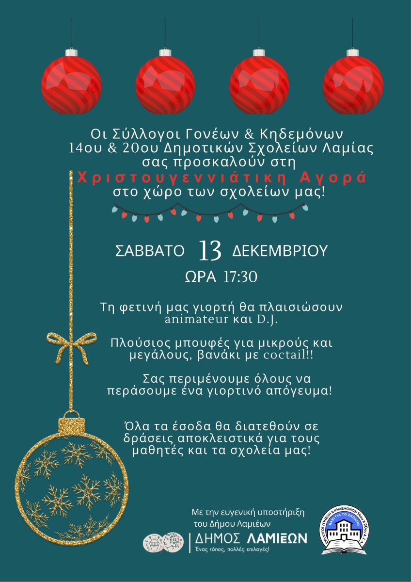Οι Σύλλογοι Γονέων και Κηδεμόνων 14ου & 20ου Δημοτικών Σχολείων Λαμίας σας προσκαλούν με μεγάλη χαρά σε ένα μαγικό, χριστουγεννιάτικο απόγευμα, το Σάββατο 13 Δεκεμβρίου στις 5:30 μ.μ..