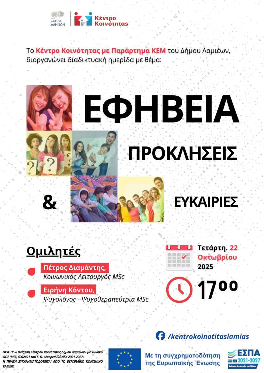 Ο Δήμος Λαμιέων και το Κέντρο Κοινότητας με Παράρτημα Κέντρο Ένταξης Μεταναστών διοργανώνουν διαδικτυακή ημερίδα με θέμα «Εφηβεία - Προκλήσεις και Ευκαιρίες». Η ημερίδα θα πραγματοποιηθεί διαδικτυακά την Τετάρτη 22 Οκτωβρίου 2025 και ώρα 17:00 μέσω της πλατφόρμας ΖΟΟΜ.