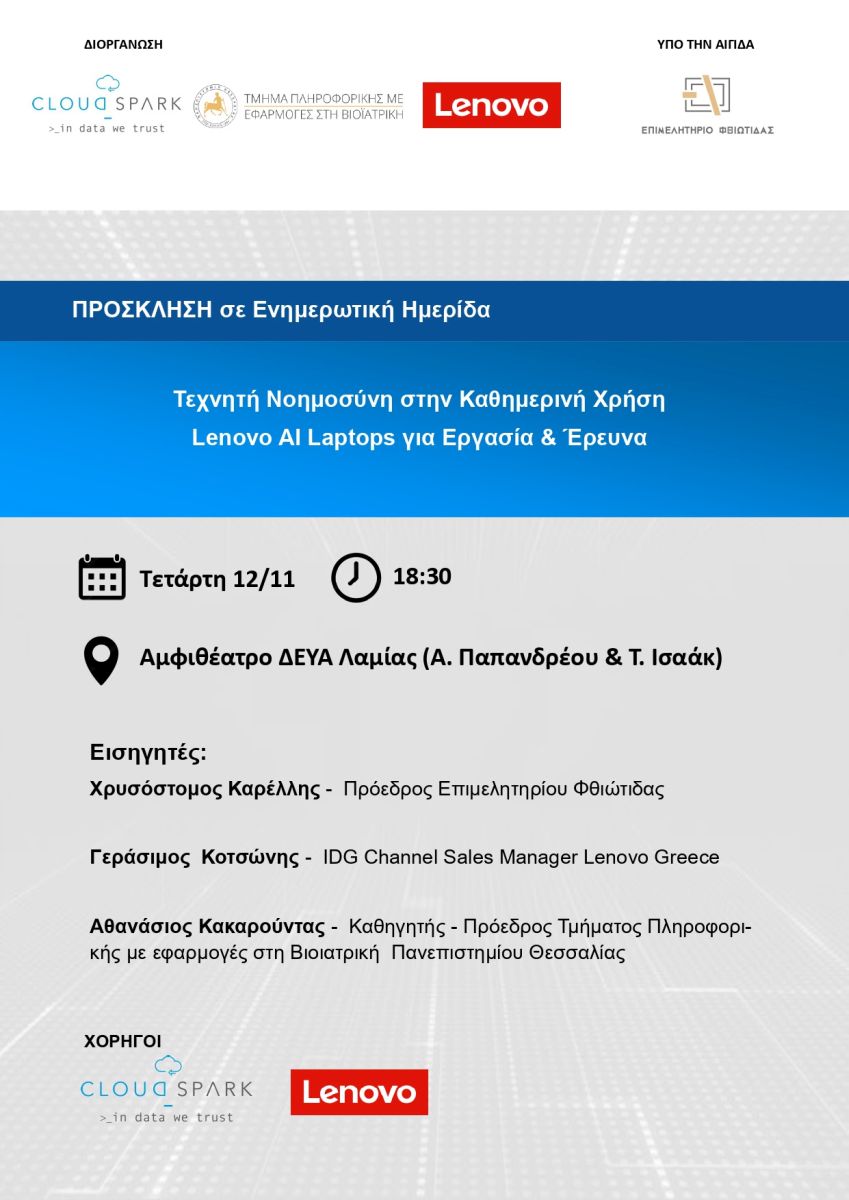 Η εταιρεία CloudSpark σε συνεργασία με το Τμήμα Πληροφορικής με Εφαρμογές στη Βιοϊατρική του Πανεπιστημίου Θεσσαλίας και τη Lenovo, σας προσκαλούν στην ημερίδα με θέμα: «Τεχνητή Νοημοσύνη στην Καθημερινή Χρήση: Lenovo AI Laptops για Εργασία & Έρευνα»