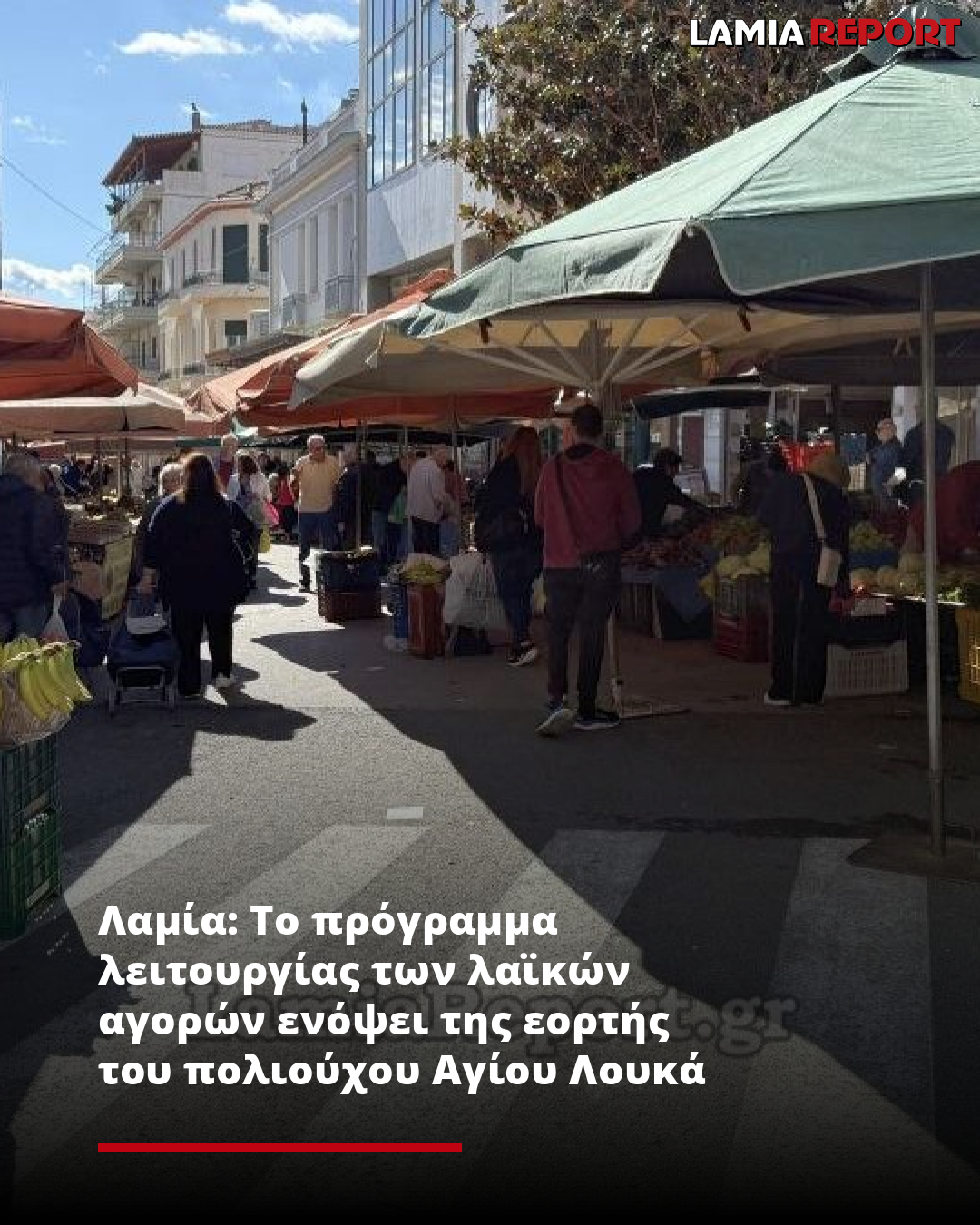 Η Διεύθυνση Γεωτεχνικών Υπηρεσιών και Τοπικής Ανάπτυξης του Δήμου Λαμιέων ενημερώνει το καταναλωτικό κοινό για το πρόγραμμα λειτουργίας των λαϊκών αγορών, ενόψει της εορτής του Πολιούχου Αγίου Λουκά.