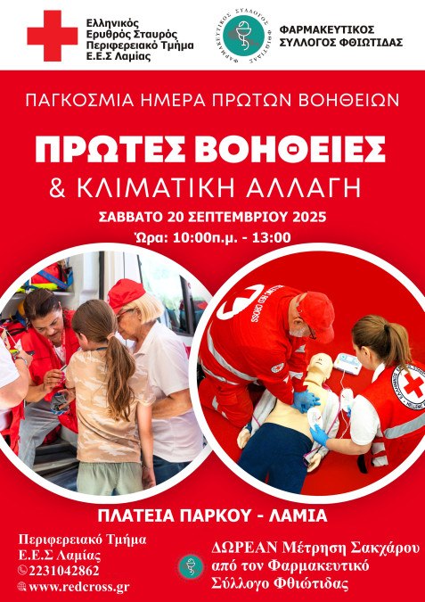 Το Περιφερειακό Τμήμα ΕΕΣ Λαμίας σε συνεργασία με τον Φαρμακευτικό Σύλλογο Φθιώτιδας, Θα πραγματοποιήσει δράση, με αφορμή τον εορτασμό της Παγκόσμιας Ημέρας Πρώτων Βοηθειών, το Σάββατο 20 Σεπτεμβρίου 2025 στην πλατεία Πάρκου στην πόλη της Λαμίας, κατά τις ώρες 10:00-13:00.