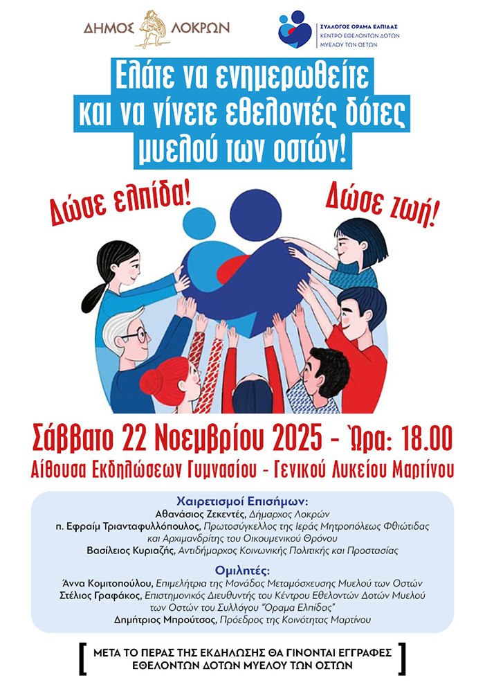 Ο Δήμος Λοκρών μας καλεί να γίνουμε εθελοντές δότες μυελού των οστών, το Σάββατο 22 Νοεμβρίου 2025, στις 6:00' το απόγευμα, στην αίθουσα εκδηλώσεων Γυμνασίου - Γενικού Λυκείου Μαρτίνου.