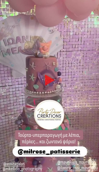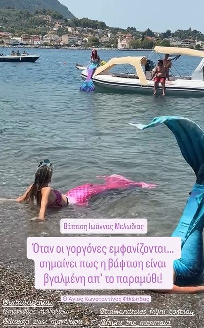 Λίγα μέτρα μακριά από τα τραπέζια, γοργόνες βγήκαν στη στεριά και πρόσφεραν ένα μοναδικό show στους καλεσμένους του ζευγαριού, ενώ τις εντυπώσεις έκλειψε και η πολυώροφη τούρτα προς τιμήν της νεοφώτιστης, σε έναν από τους ορόφους της οποίας «κατοικούσαν» ζωντανά ψάρια.
