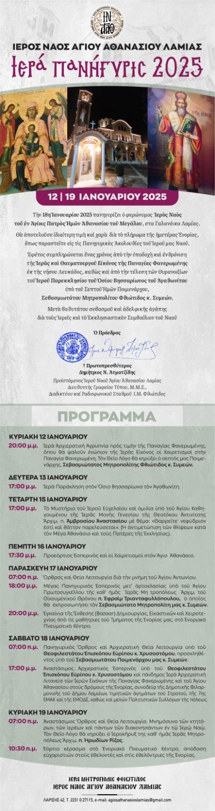 «Με Ιερά Αρχιερατική Αγρυπνία υπό του Σεβασμιωτάτου Μητροπολίτου Φθιώτιδος κ. Συμεών ξεκίνησαν το βράδυ της Κυριακής 12 Ιανουαρίου 2025 οι εορταστικές Ακολουθίες για την ετήσια Πανήγυρη της πολυπληθούς Ενορίας του Αγίου Αθανασίου στα Γαλανέικα της Λαμίας.