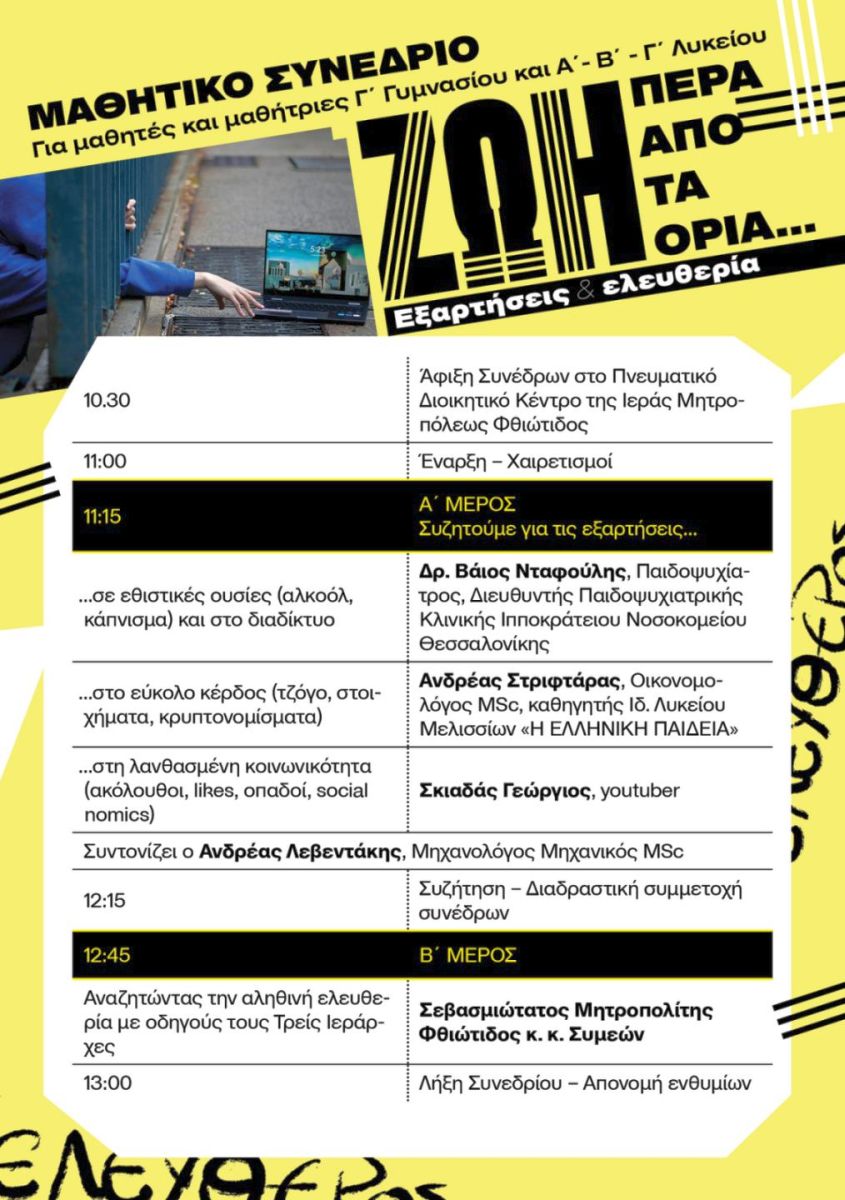 Στο Συνέδριο συμμετείχαν μαθητές και μαθήτριες του 1ου Γυμνασίου Λαμίας, του 2ου Γυμνασίου Λαμίας, του 4ου Πειραματικού Γυμνασίου Λαμίας, του 7ου Γυμνασίου Λαμίας, του 9ου Γυμνασίου Λαμίας, του ΓΕΛ Καμένων Βούρλων και του Προτύπου Εκκλησιαστικού Σχολείου Λαμίας. Οι ομιλίες των εισηγητών εστίασαν σε δύο κεντρικούς πυλώνες: στη φύση των εξαρτήσεων, αλλά και στις μεθόδους «απελευθέρωσης» από αυτές. Αναλύθηκε η παθολογία του εθισμού, καλύπτοντας ένα ευρύ φάσμα επικίνδυνων έξεων, όπως τον τζόγο, αλλά και την υπερβολική ενασχόληση με το διαδίκτυο και τα μέσα κοινωνικής δικτύωσης. Οι μαθητές/τριες αναζήτησαν τα αίτια που οδηγούν στον κυκεώνα των εξαρτήσεων, αλλά και τις διεξόδους που προσφέρει η κριτική σκέψη και η πνευματική θωράκιση.